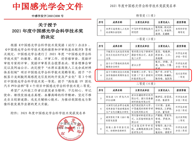 近日,中国感光学会发布了“关于授予2021年度中国感光学会科学技术奖的决定”,在全国感光影像科技领域内评选出了自然科学类特等奖1项,技术发明类和科学技术进步类一等奖3项、二等奖4项。其中,我院陈广学教授团队“基于印刷制造技术的纸基传感器的高效制备及其应用” 项目荣获技术发明类一等奖。