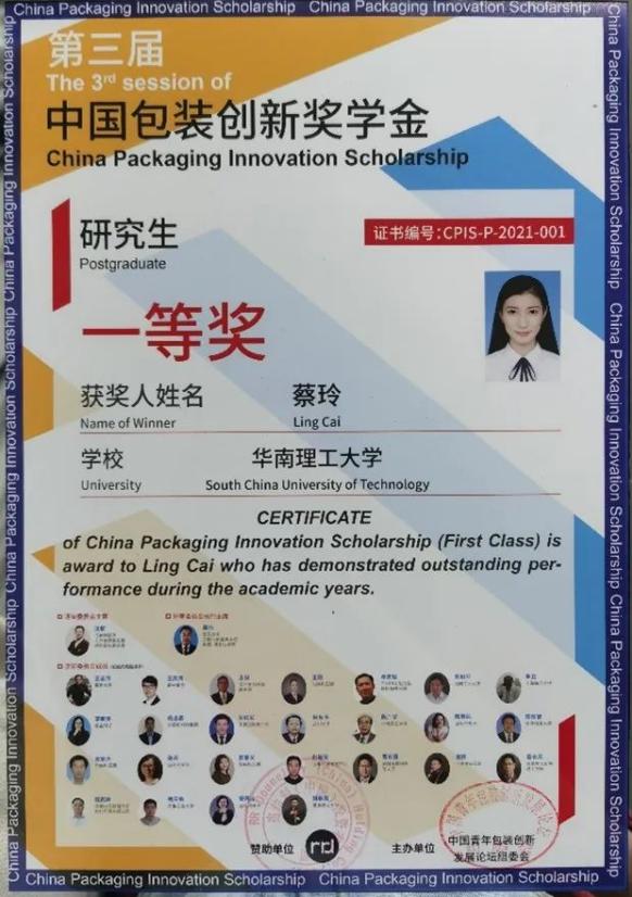 成果是对自己努力的最好证明。2021年,蔡玲带着科研成果报名参加了由中国包装联合会、中国青年包装创新发展论坛组委会、武汉大学主办的“第三届中国包装创新奖学金”。通过报名名单,蔡玲了解到竞争者很多,而且大都成果颇丰,实力很强,这给她带来了巨大的心理压力。还好她的师兄及时抽出时间,帮她分析各个竞争者的优劣,也对她参赛的科研成果进行肯定。在师兄的鼓励和支持下,在全国众多研究生激烈角逐下,经历了材料审核、两轮评审和线上答辩后,蔡玲荣获了研究生组唯一的一等奖。正如她所说:“参赛前其实也没有足够的把握,但很庆幸自己曾经全力以赴去准备,享受到竭尽全力付出后收获成果的喜悦。”