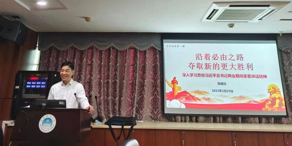 2022年3月22日下午,张建功为今年上半年发展的预备党员和转正的党员讲授思政第一课。张建功首先带大家深入学习习近平总书记在全国两会期间重要讲话精神和全国两会精神,并结合其自身经历和感悟,带领同学们深刻领悟“五个必由之路”和“五个有利条件”的重大含义和内在逻辑。张建功鼓励学生党员以两会为契机,深入学习和传承两会精神,发挥好党员先锋模范作用,在疫情当下,进一步增强自身的责任感与使命感,传承新时代轻工人精神,用积极向上的斗志和力量助力学校和学院蓬勃发展。