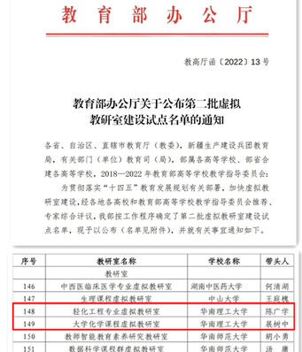近日,教育部发文公布第二批虚拟教研室建设试点名单的通知,我校获得2项,其中我院轻化工程专业虚拟教研室获得立项建设。