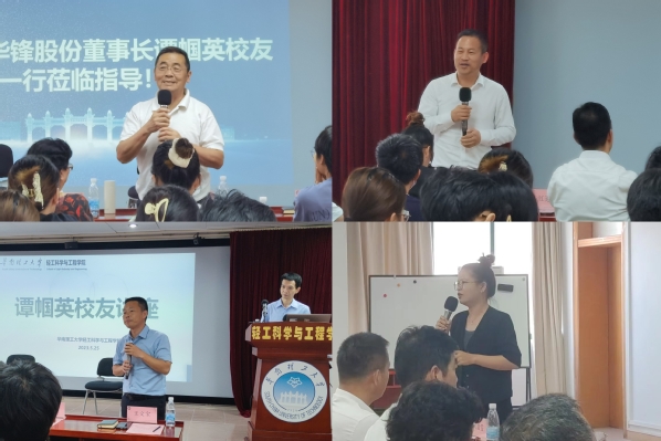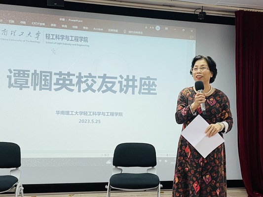 谭帼英校友从1977年大学毕业后主动申请援藏的经历谈起,分享了她和先生在西藏克服重重困难取得成果的经历。援藏结束后,她回到华工从事学生工作,回顾在华工工作的日子,谭帼英讲述了当年对学生急切的关心和爱护,她对待学生如朋友,如亲人,在谈及一些优秀的学生时更是满心欢喜。她还分享了当年参加学校鲜花队的经历,当时我校承接了第六届全运会的鲜花队,并得到了上级的表扬。1995年,谭帼英校友下海创业,创建了肇庆华锋电子铝箔有限公司。谈起公司现在的发展,谭帼英校友仍然有着年轻时的雄心和活力。2018年她带领公司加入新能源汽车的赛道转型升级,现在她又重新回到董事长岗位,继续在新能源的道路上不懈奋斗。她以亲身经历引导学生认识当前新能源发展态势下的创业机遇,强调培养创新创业能力的重要性。