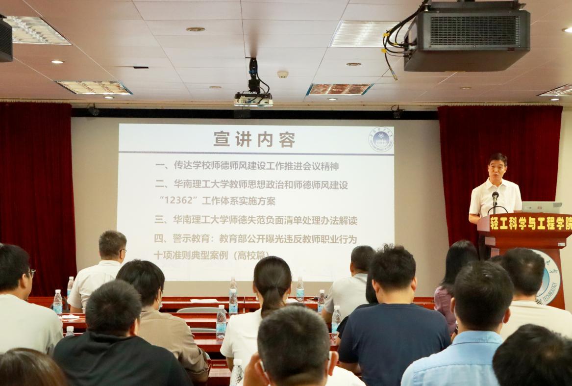 张建功传达了学校师德师风建设工作推进会议精神,强调了加强师德师风建设的重要性,明确将进一步压实主体责任,加强党风廉政建设。他从制定的背景、指导思想、主要目标、重点任务等方面介绍《华南理工大学教师思想政治和师德师风建设“12362”工作体系实施方案》,阐述了“坚持党委统一领导”、“压实校院两级责任”、“落实三项引航举措”、“建设六大工作机制”和“推进两条主线建设”5项重点任务。同时,详细介绍了24项教师师德失范行为负面清单及处理办法,并讲解了教育部公开曝光违反教师职业行为十项准则的警示案例。张建功提出三点要求;一是强教必先强师,要把师德师风建设摆在首要位置,广大教师要坚定理想信念、陶冶道德情操、涵养扎实学识、勤修仁爱之心,坚守三尺讲台,潜心教书育人;二是要狠抓落实,充分发挥教师党支部的党建引领和党员教师的模范带头作用,强化第一责任人意识,紧盯重点人、重点事,做到师德师风学习教育全覆盖;三是要常抓不懈,教师要把立德树人融入到教育教学的各方面,坚持做“四有”好老师、“四个引路人”,持续推进师德师风建设。他最后强调,全院要以入选“全省党建工作标杆院系”和“全省党建工作样板支部” 培育创建单位为契机,充分发挥基层党组织和教工党员的引领示范、辐射带动作用,时刻绷紧“安全弦”,提高政治站位,强化政治担当,自重自省自警自励,立身从教立德树人。