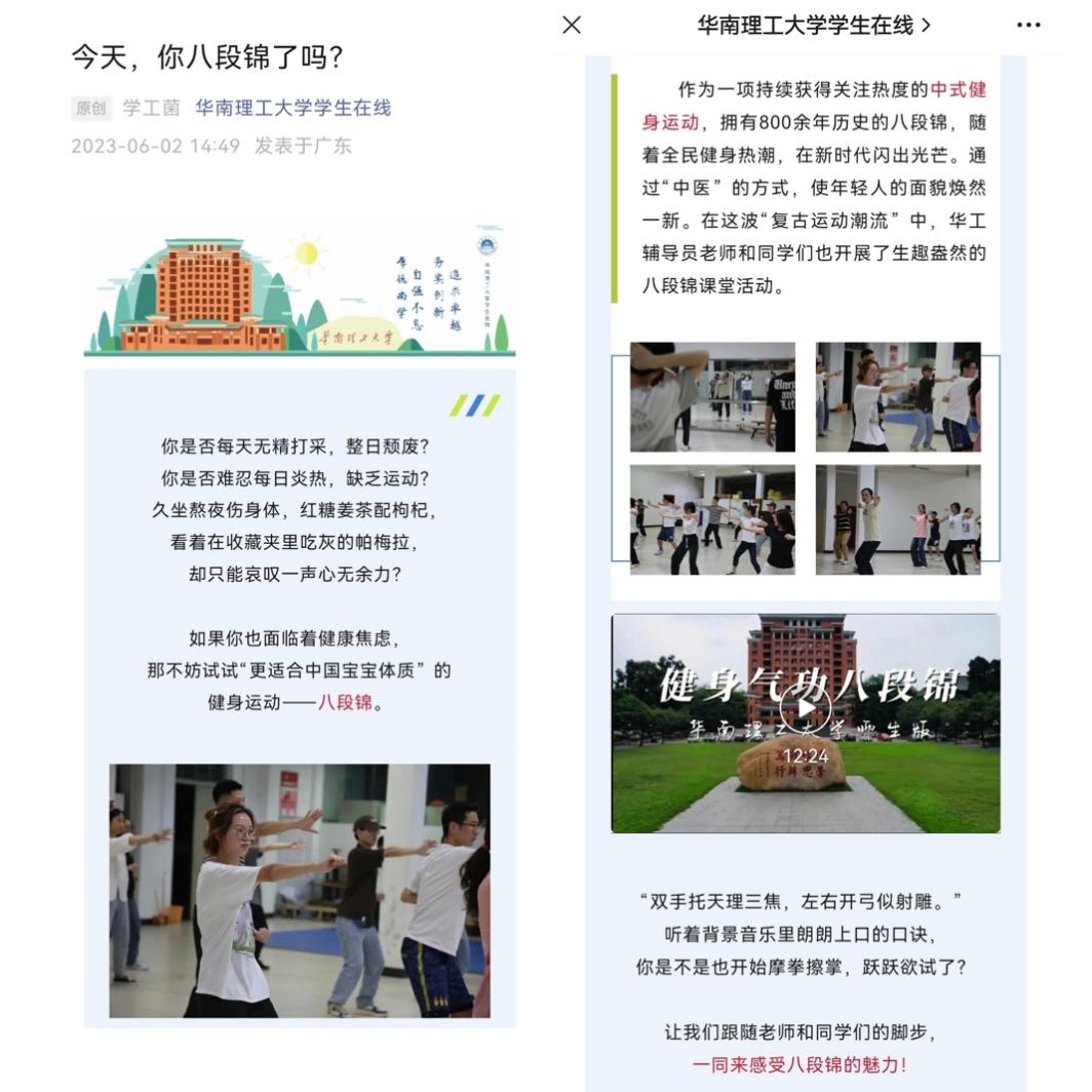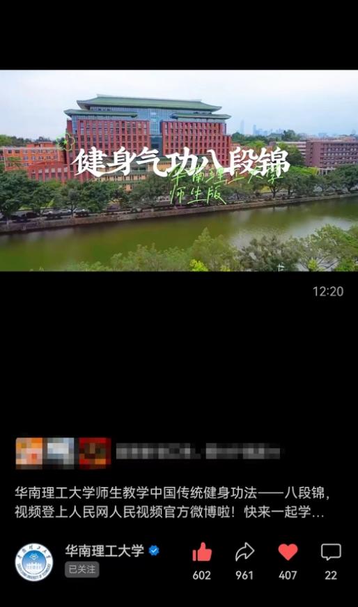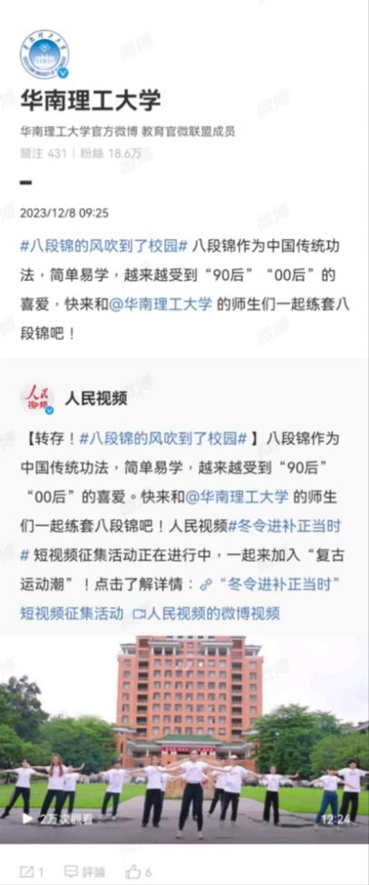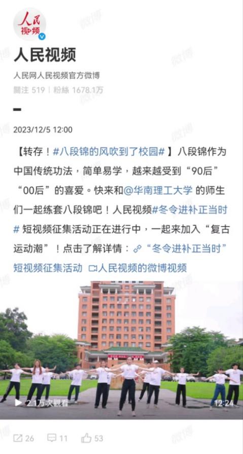 近期,由华南理工大学学生在线公众号发布的微信推送《今天,你八段锦了吗?》,其中所包含的主题视频《健身气功八段锦—华南理工大学师生版》在12月5日获人民视频官方微博推荐展示。