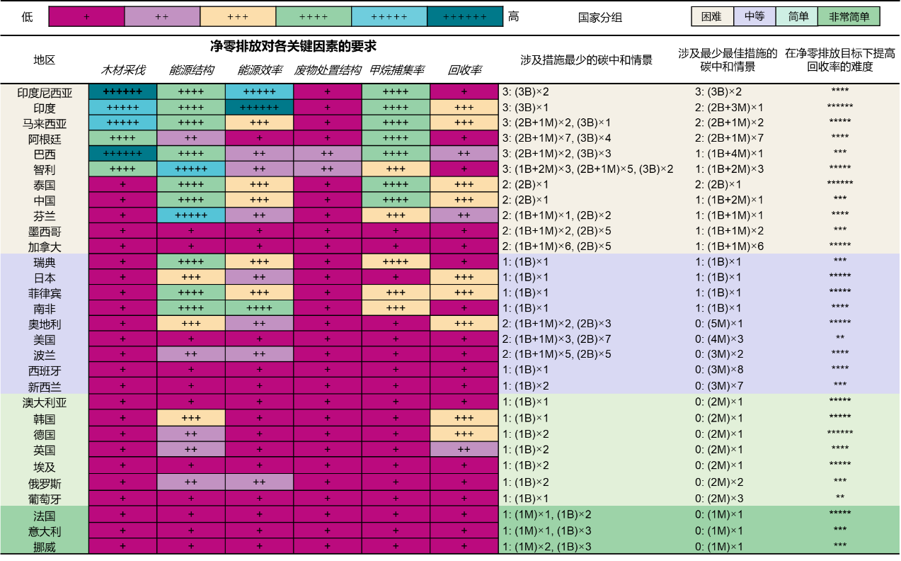 到2050年,30个国家造纸行业都有望实现净零排放,但实现的可能性和难度显著不同(图3)。多数发展中国家造纸行业2050年实现净零排放的目标面临着显著挑战,而意大利、法国、挪威等欧洲国家的造纸行业实现净零排放的难度相对较低。多数发达国家可以通过单一措施实现净零排放,但需基于特定环节实施极具挑战性的改进措施;大多数发展中国家净零排放目标的实现则需要依赖多个阶段措施的紧密配合。除了能效提升和能源转型等措施外,森林资源丰富的热带发展中国家应优先考虑加强可持续森林管理,而其他发展中国家应更加重视废纸管理相关措施。