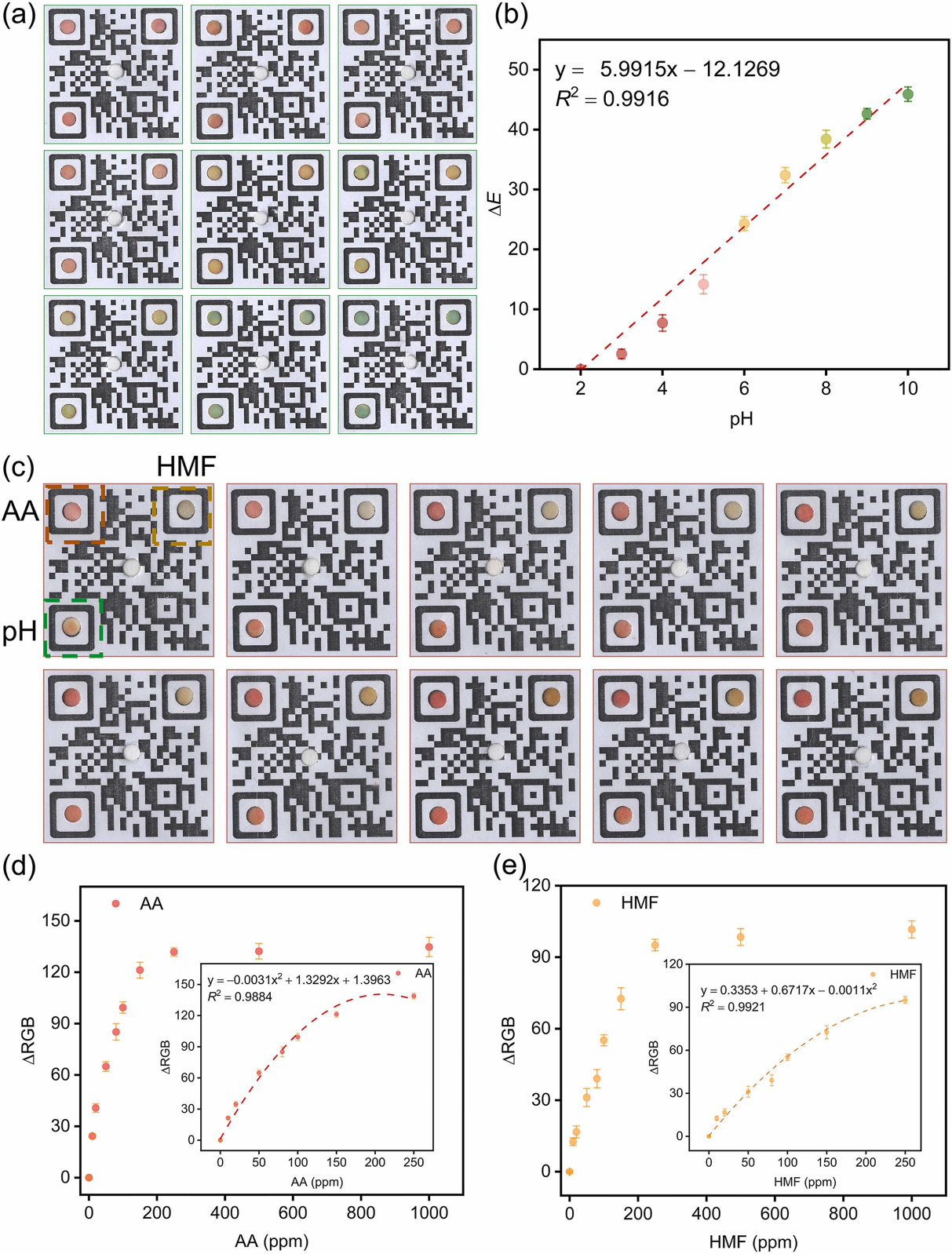 图3(a)QR编码pH测定的图像。(b)ΔE与pH值的函数关系。(c)QR编码的AA和HMF测定的图像。(d)ΔRGB与AA浓度的函数关系。插图:浓度范围从0到250 ppm的多项式拟合。(e)ΔRGB与HMF浓度的函数关系。插图:浓度范围从0到250 ppm的多项式拟合。