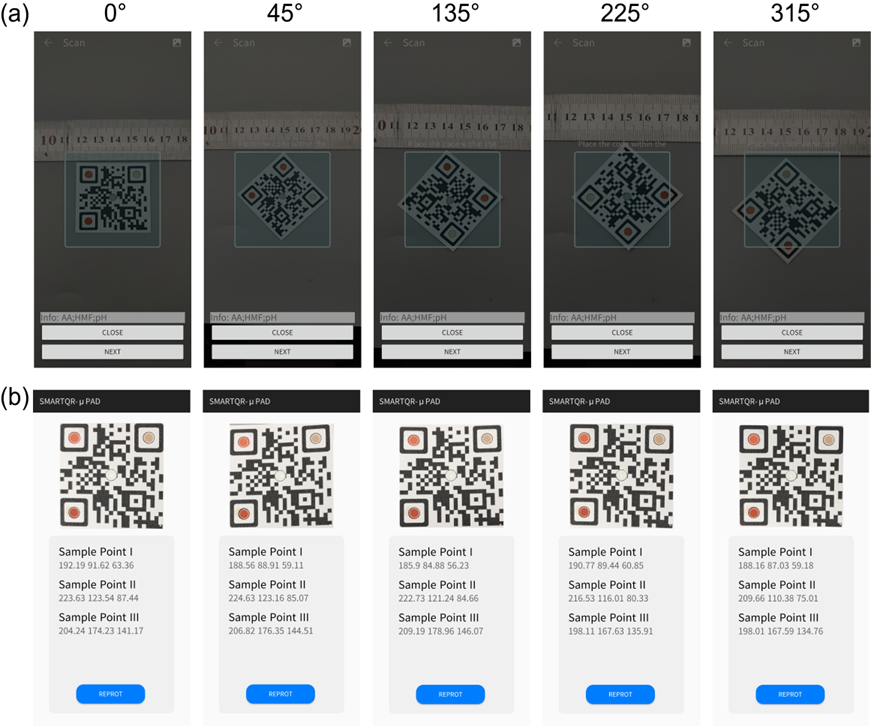 为适应不同场景中扫描条件的变化,智能纸基微流控的应用程序增加了白色方框和Hu矩不变量作为辅助扫描工具。这些工具帮助用户调整扫描距离和角度,并确保即使二维码被旋转,应用程序也能准确识别并校正图像(图5)。通过这种方式应用程序可以有效地减少拍摄距离和旋转角度对二维码识别和传感信号分析的干扰。