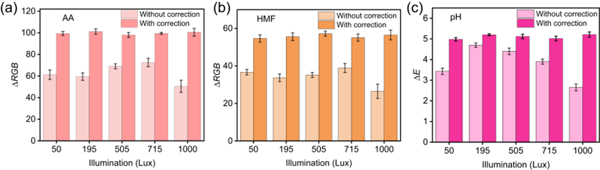 此外,为了进一步证明颜色校正和定量方法的性能,还分析了在一系列典型环境照明条件下颜色校正前后检测程序的稳定性,并对AA、HMF 测定的ΔRGB值和pH测定的ΔE值的变化趋势进行系统性研究。结果证实,在这些不同的照明条件下,校正后的 ΔRGB值没有显着差异(图6)