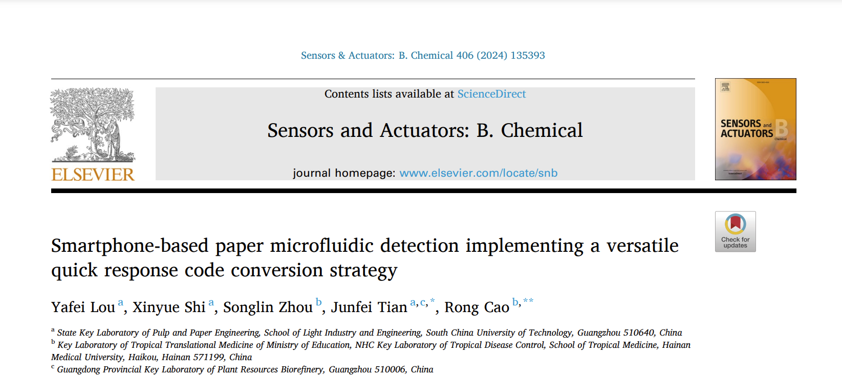 相关研究成果以“Smartphone-based paper microfluidic detection implementing a versatile quick response code conversion strategy ”为题发表于《Sensors and Actuators: B. Chemical》。华南理工大学轻工科学与工程学院博士生娄亚飞为第一作者,通讯作者为华南理工大学轻工科学与工程学院、制浆造纸工程国家重点实验室田君飞教授和海南医学院曹榕副研究员。