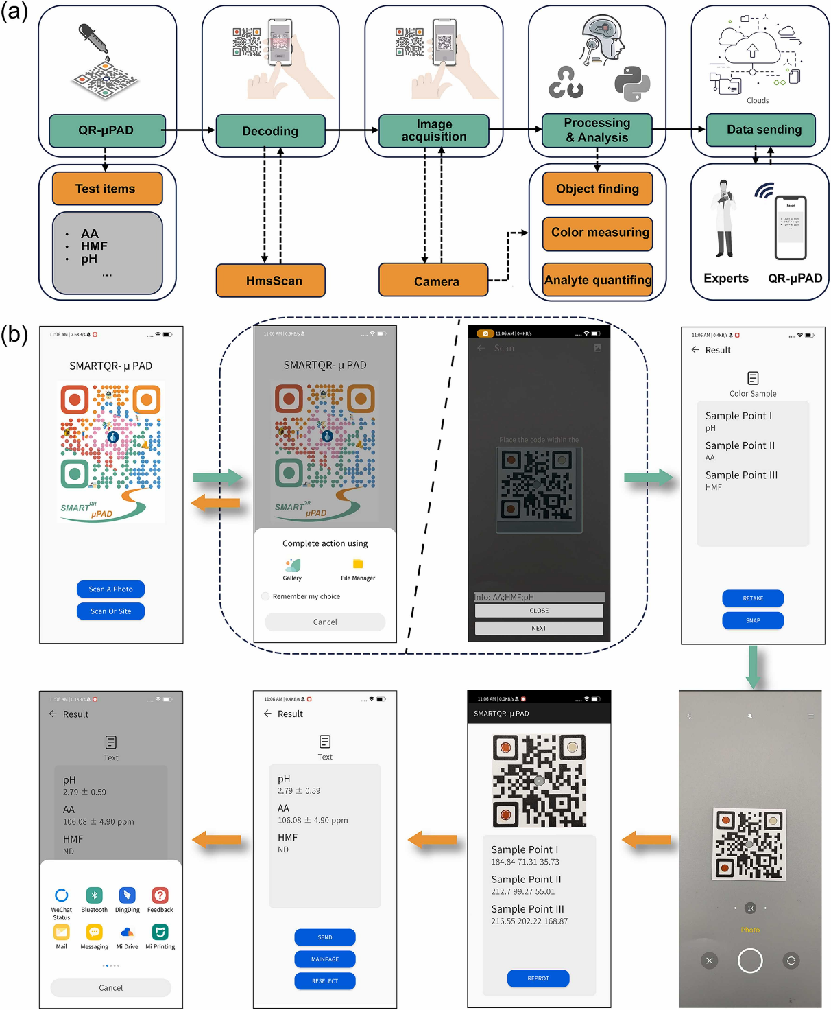 (b) “SMARTQR -µPAD”应用程序的基本工作流程图像。