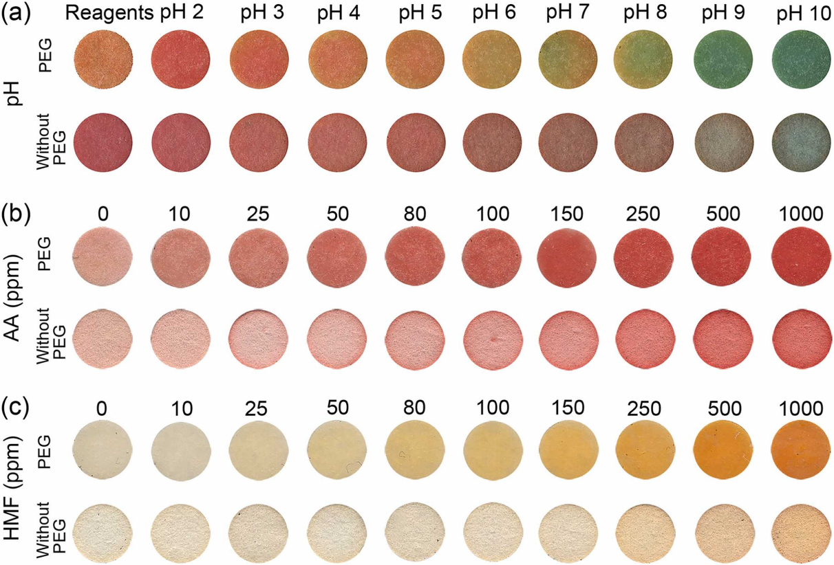 (b)AA(浓度为0-1000 ppm)和(c)HMF(浓度为0-1000 ppm)的比色反应。