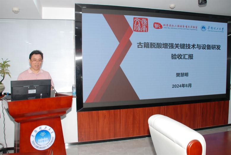 6月11日,广州市重大科技项目“古籍脱酸增强关键技术与装备”项目验收会议在造纸D楼306会议室举行。来自广东省博物馆、广州市档案馆、国家版本馆广州分馆、中山大学图书馆、农讲所纪念馆等文博领域的专家,以及广州大典研究中心、华南理工大学、岭南文献保护研究中心等单位的领导和专家参加了会议。会议由学院党委书记张建功主持。