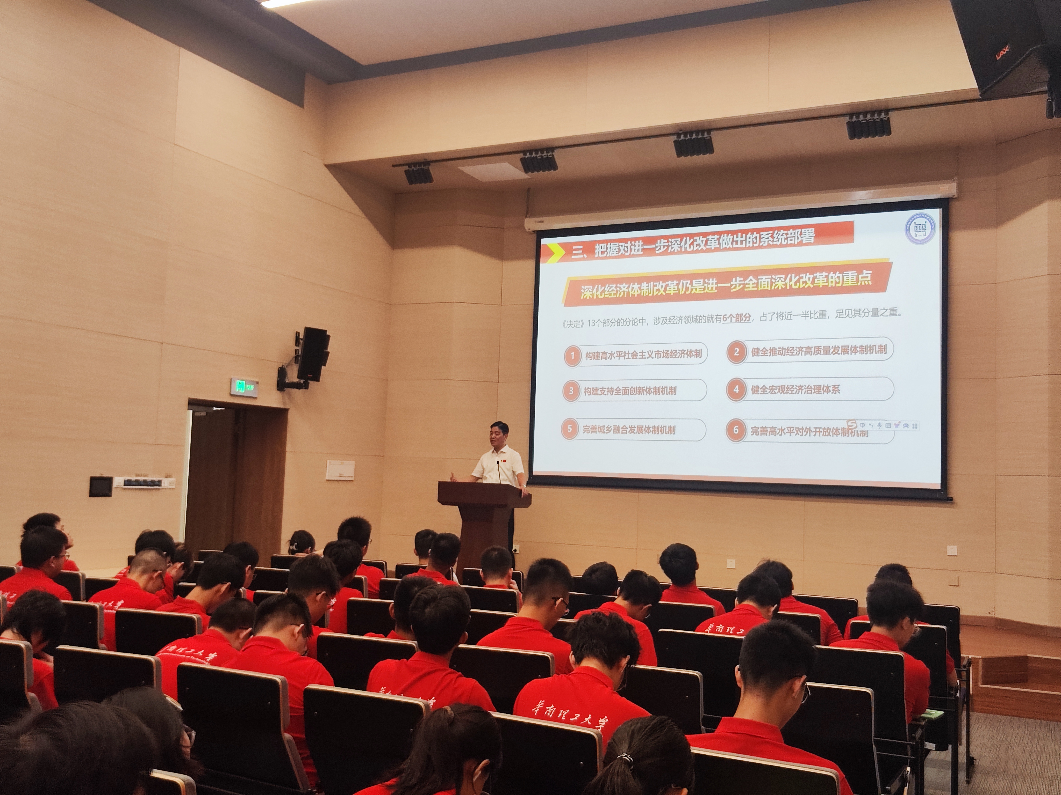 在新生入学教育上,学院党委书记张建功以学习党的二十届三中全会精神为主线,围绕《以青春之力书写中国式现代化新篇章》的主题,为2024级新生讲授“思政第一课”,勉励同学们要乘梦想之势,立“鸿鹄”大志;乘信念之势,强“钢铁”意志;乘发展之势,增“超越”本领;乘变局之势,树“破浪”担当,争做好砥砺奋进新青年,为实现中华民族伟大复兴的中国梦贡献青春力量。