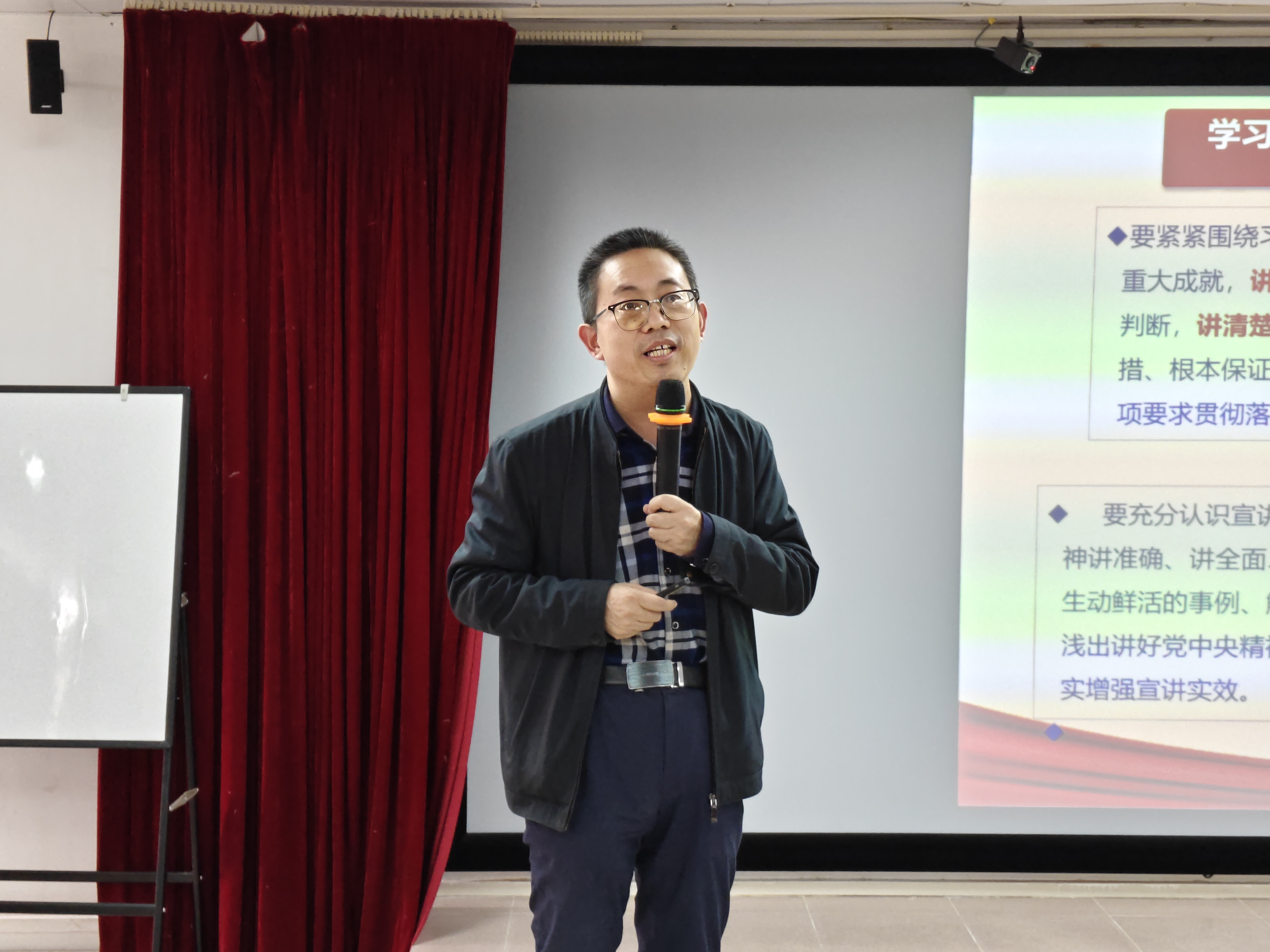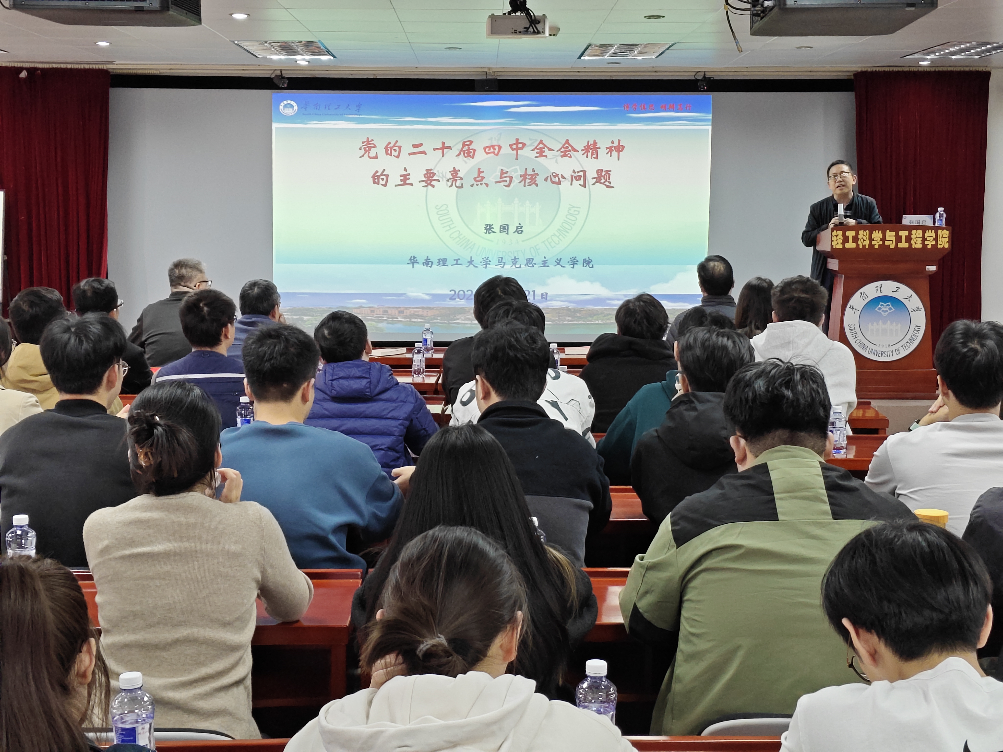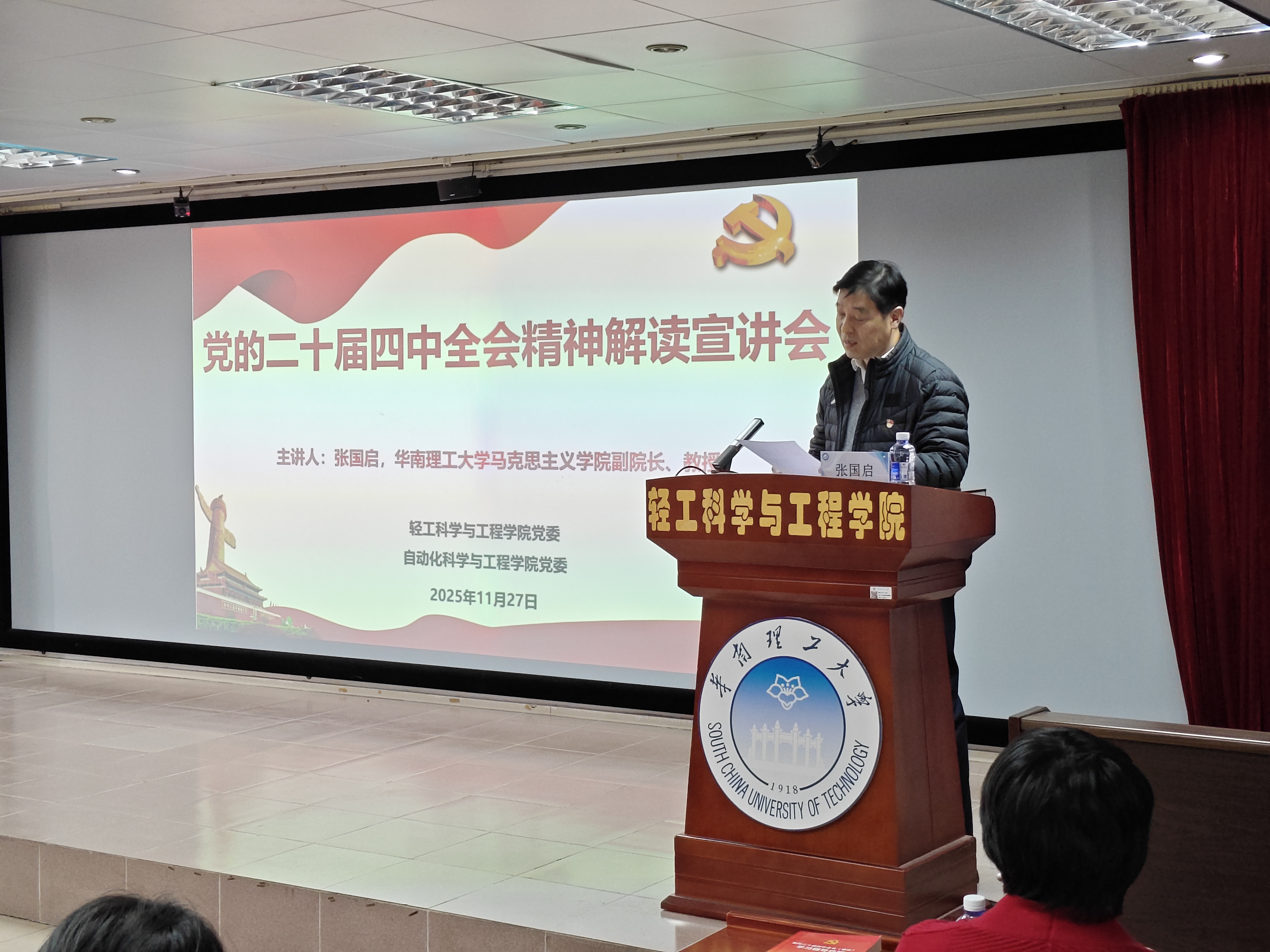 11月27日下午,轻工科学与工程学院党委举办“党的二十届四中全会精神解读”专题报告会,特邀马克思主义学院副院长张国启教授主讲。学院党委书记张建功主持会议并讲话,学院全体教工党员、部分学生党员代表近150人参加学习。