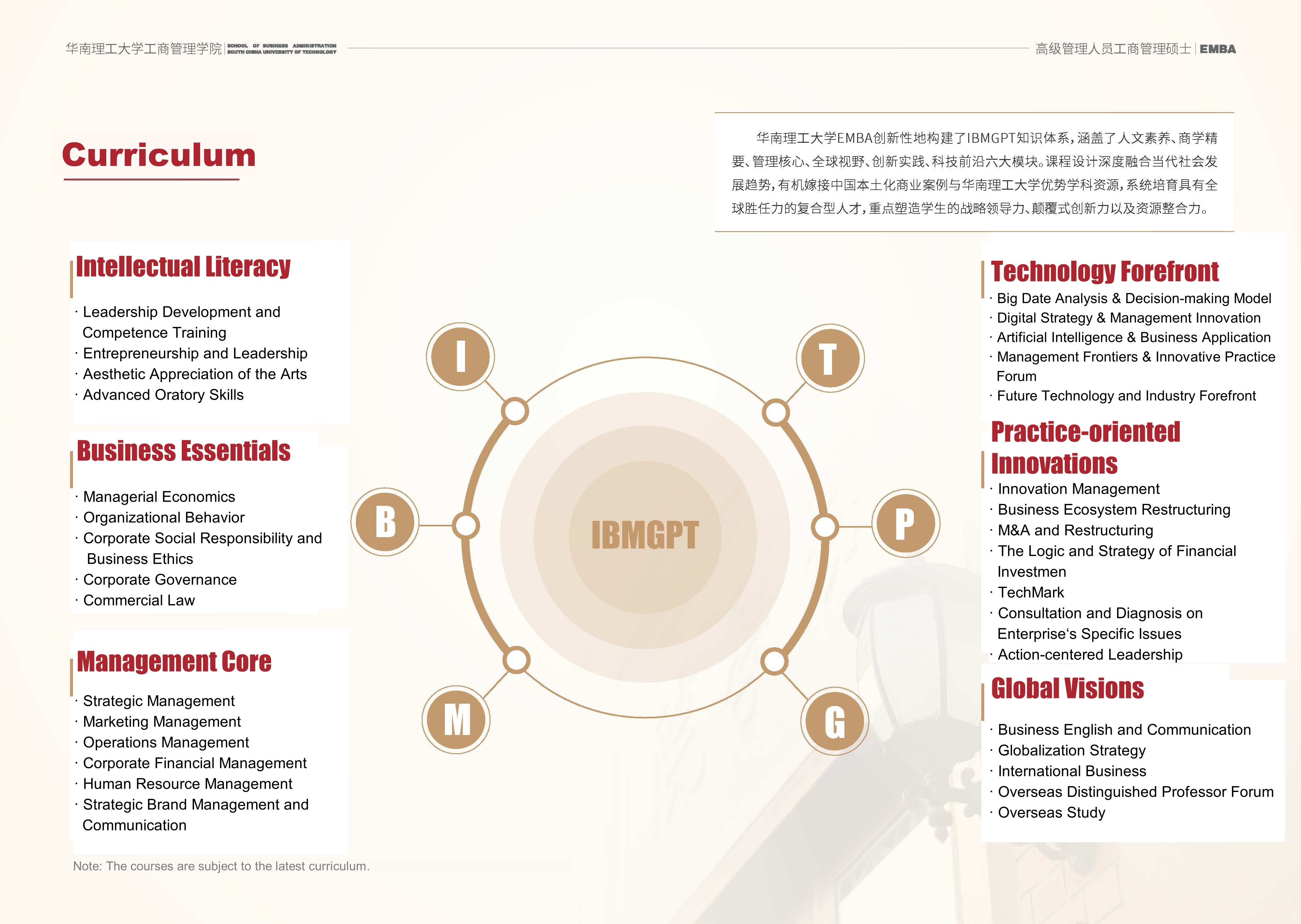 The curriculum is deeply integrated with contemporary social and economic trends, organically incorporating localized Chinese business cases alongside the disciplinary strengths of South China University of Technology. It systematically cultivates students' strategic leadership, disruptive innovation capabilities, and resource integration skills, nurturing well-rounded management talents equipped with global competence.