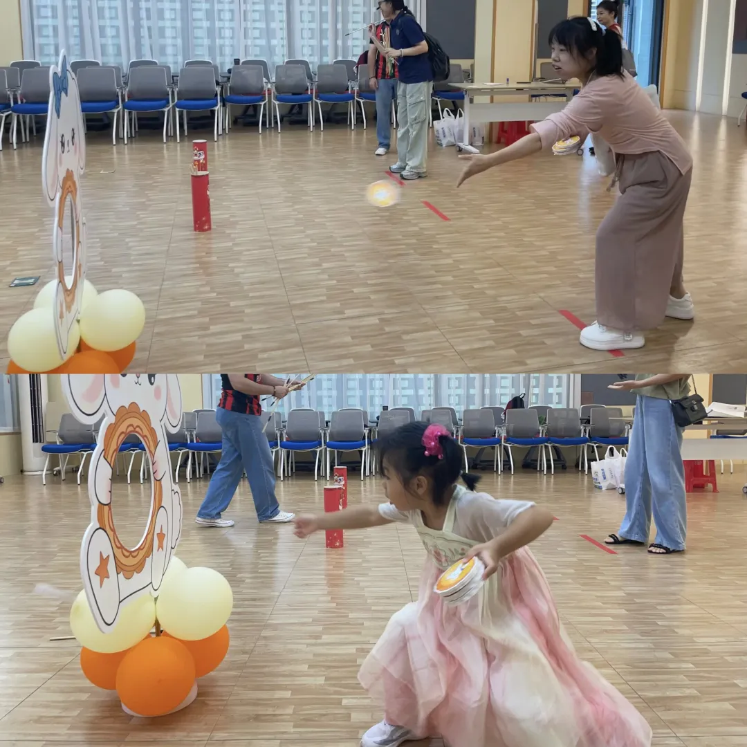 互动游戏区气氛热烈,趣味投壶、猜灯谜和“玉兔吃月饼”游戏吸引了众多教职工参与。在投壶摊位,不少老师展现出不俗的“箭术”;猜灯谜区域,大家开动脑筋,破解一个个中秋谜题;而“玉兔吃月饼”游戏则充满了欢声笑语,老师们争相将月饼造型沙包投入玉兔立牌中。