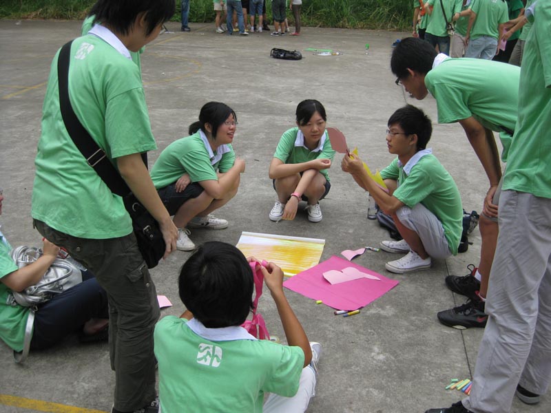 九日早上八点二十的时候,北十三楼下就已经有人在等候了,不得不称赞这届的师弟师妹们真有时间观念。九点钟,所有人在篮球场集合,准时开始进行素拓。主席和常委们开始致辞,对09 的新生表示欢迎,然后部长把全部的92位同学分成10个队伍。正式进入第一个环节。09的新生们创意无限,每个队伍自己选一位模特,然后给模特设计造型。他们的想法足够新颖,有华工特色的超人,还有十分雷人的雨神,还有美丽的华工小姐~夏日的沙滩女神……这个环节主要是促进成员之间的沟通,交流,通过团队的合作,增强他们的集体观念,合作意识,果然,不到30分钟的时间里,他们互相之间都已经很熟悉彼此了,不但能叫出名字,有的相互之间还开起了玩笑。就这样,产生了十个小分队。