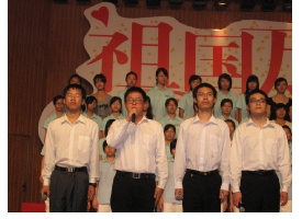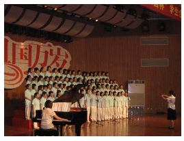 下午2点30分,比赛正式开始。第一支队伍是由广州汽车学院的同学的《爱我中华》。我们是第五支队伍。参赛曲目是《茉莉花》。我们的SHOWTIME是高潮迭起的,先是四位男同学的诗朗诵,他们充满阳刚的声音震撼了在场的每一位,其后是充满女子柔情的合唱,一曲《茉莉花》更道出了我们对祖国的热爱。这充满了对比的精彩演出征服了评委获得了优胜奖。