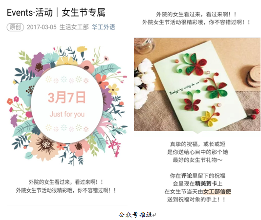 活动前夕,生活女工部构思了祝福贺卡等活动并参与制作且发布了相关推送。