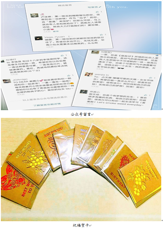 同学们的积极性与参与度很高,纷纷在公众号上留言,每一条留言都是最真诚的祝福。生活女工部在女生节当天为留言的同学们送上了祝福贺卡。