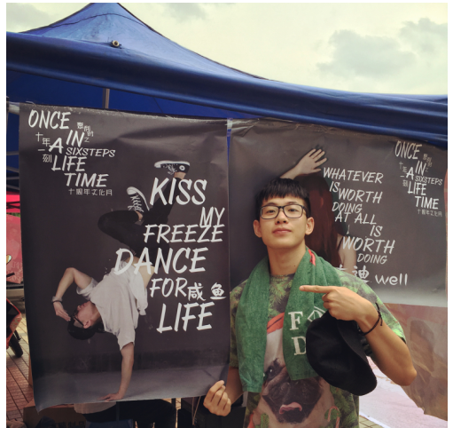 街舞,是一种极限运动。用身体的协调,与地板的碰撞,从而做出不可思议的动作。他是Kook街舞社街舞协会副会长,Kook街舞协会七周年晚会、Sixsteps街舞协会十周年晚会的编舞与表演者。在校园里时而能看到他突然出现的快闪表演。当被问及是如何喜欢上街舞时,他谈及在初一的时候加入了学校的街舞社团,那时候只是单纯地想耍帅,但后来渐渐了解并喜欢上了街舞的文化,态度转变成认真学习街舞,并想要创造属于自己的东西。结果这一尝试一喜欢,就是8年。训练表演留下的内伤外伤,都无法让他停止跳舞的脚步。在大学,他依然坚持着训练,在晚上九点半的人文馆挥洒汗水。他对于自己的表演严厉苛刻,每次编排都希望给大家带来完美无瑕的表演。同时他也喜欢在编排中加入搞笑的元素,为大家带来欢乐。他还在车联万象年会、喜燃能源有限公司年会、悦荞茉萱公司发布会、汽车族华工宣讲会、安利华工招聘会等公司担任过表演嘉宾,娱乐他人,锻炼自己。