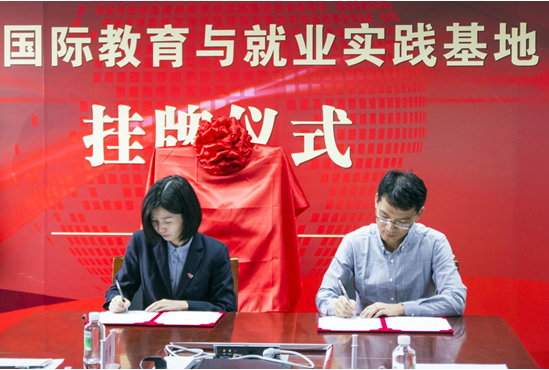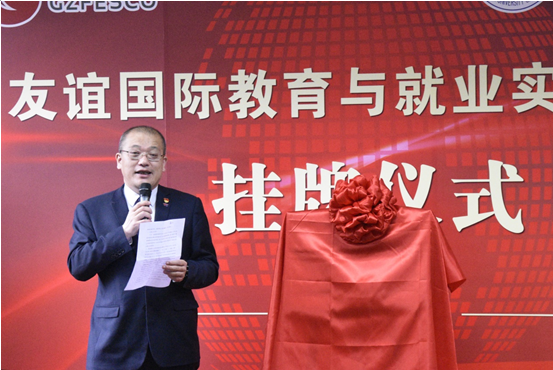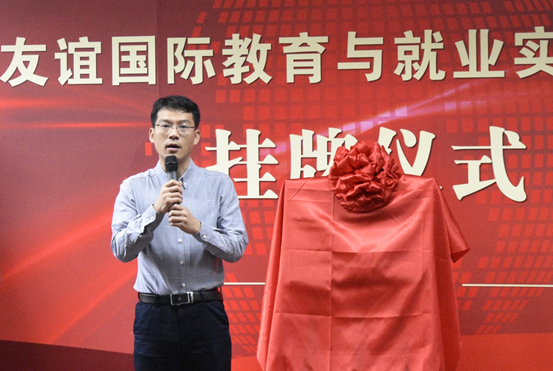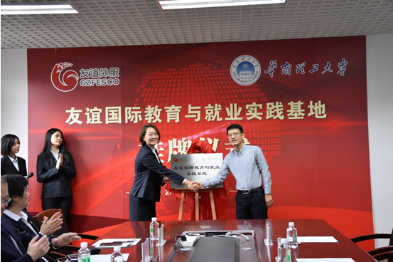 11月10日上午,“友谊国际教育及就业实践基地”挂牌仪式在外国语学院4号楼隆重举行,外国语学院和广州市友谊对外服务有限公司(下称“友谊外服”)就实施人才留学和就业规划培养项目事宜达成战略合作。外国语学院党委副书记赵水东,辅导员杨怡斐,友谊外服上级集团中广国际公司副董事长、总经理黄崴,友谊外服董事长雷梅,友谊外服总经理张颖,友谊外服留学服务中心总监刘婵等出席典礼,与众多在校学生及友谊外服员工共同见证这个隆重时刻。
