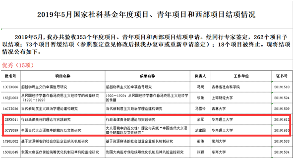 63日,全国哲学社会科学工作办公室公布了20195月国家社科基金项目结项情况,华南理工大学武建国教授主持的“中国当代大众语篇中的篇际互文性研究”和余军教授主持的“行政法律责任的理论与实践研究”项目获得优秀等级结项。