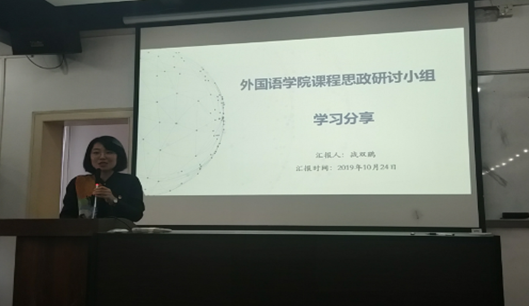 大英教工党支部组织委员战双鹃分享了大学英语课程思政研讨小组建设方案。战双鹃老师介绍了课程思政建设的背景,然后对课程思政概念进行了梳理。她指出课程思政不是思政课程,而是通过“把盐加入水变成盐水”的方式,在课程中融入正确的价值观,以彰显我国优秀文化传统,弘扬民族文化,加强课程立德树人的功能。战老师同时提出了大英团队课程思政的建设措施:组建大英课程思政研学团队、开展课程设计实践、思辨课程思政理论内涵,以此推动落实学院对课程思政建设的顶层设计和规划。