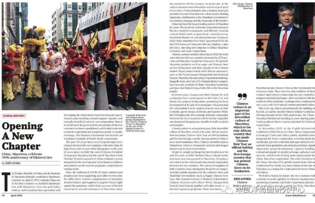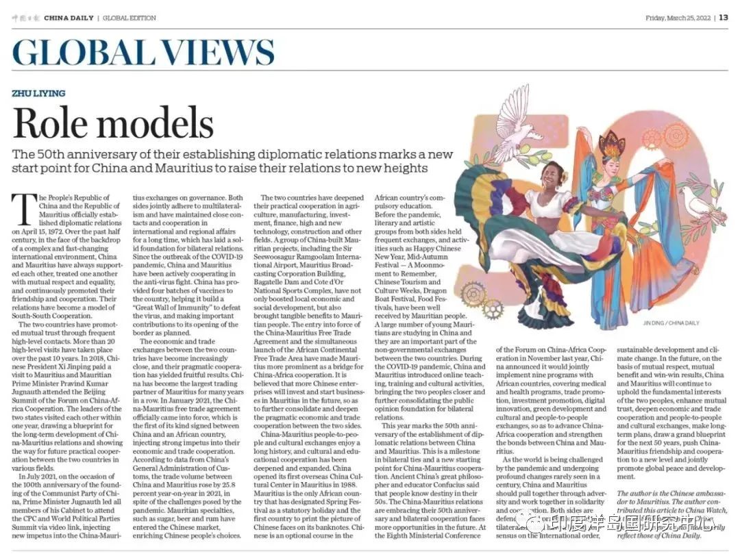 近日,《中国日报》海外版、《中国与非洲》杂志分别刊登朱立英大使的署名文章,庆祝中国同毛里求斯建交50周年。