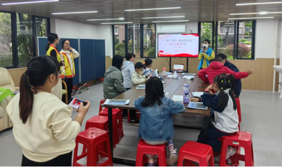 在名字记忆挑战环节中,社工引导小朋友们相互认识、彼此熟悉。活动开始后小朋友们依次向大家进行自我介绍。随后,社工随机挑选小朋友,邀请其说出两侧相邻小朋友的名字,部分小朋友信心十足,主动挑战记住所有小朋友名字的任务。这一环节,为后续共同阅读红色绘本、制作手工等奠定了基础。