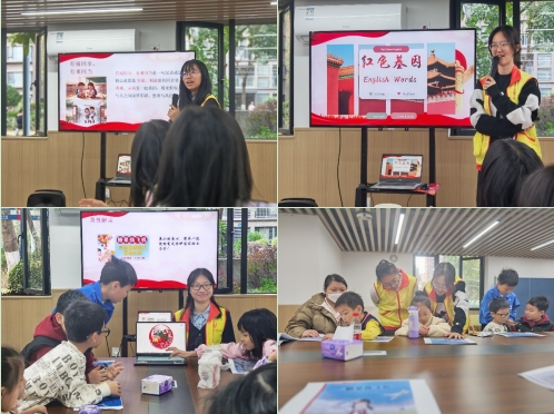 绘本领读结束后,志愿者解读绘本中的核心文化与历史知识,以生动讲解与互动提问让抽象的精神理念与历史知识变得具体可感。志愿者白童舒还展开了红色英文词汇讲解,分为革命历史篇、学习活动篇、劳动生产篇与丰收篇四大类,通过趣味联想、场景代入等方式帮助小朋友们快速记忆,让孩子们在学习语言的同时深化对红色文化的理解,培养用双语讲述中国红色故事的能力。