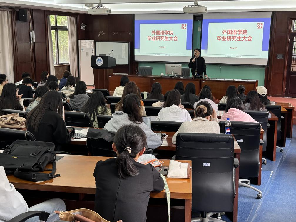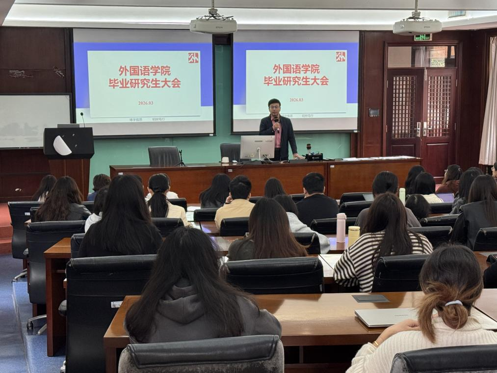 3月5日下午,外国语学院2026届全体毕业研究生大会在学院楼201会议室顺利举行。学院副院长武建国、党委副书记赵水东、专业研究生部主任徐阳子、副主任杜可君、学工辅导员杨怡斐、博士生班主任车思琪出席会议。全体2026届毕业研究生,包括2022级博士生、2023级学术硕士生、2024级笔译专业学位硕士生及2023级口译专业学位非全日制硕士生共计80余人参加了会议。