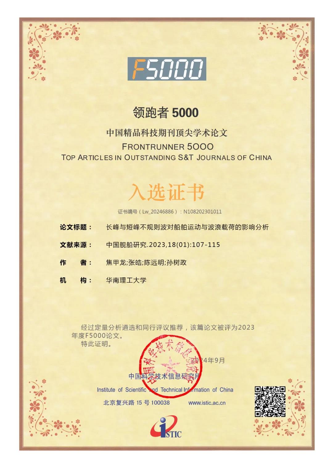 近期,国家科学技术部中国科学技术信息研究所(中信所)发布了“领跑者5000——中国精品科技期刊顶尖学术论文”(简称F5000)入选论文名单,团队发表在《中国舰船研究》的论文“焦甲龙, 张皓, 陈远明, 等. 长峰与短峰不规则波对船舶运动与波浪载荷的影响分析[J]. 中国舰船研究, 2023, 18(1): 107-115.”(论文DOI: 10.19693/j.issn.1673-3185.02679)入选2024年度F5000。“F5000”论文是采用科学计量指标和同行评议结合的方法,每一年度从中国精品科技期刊中选取各学科累计被引次数排名前1%的优秀学术论文。遴选出的论文将通过“领跑者5000-中国精品科技期刊顶尖学术论文平台(F5000)”集中在国际上进行展示和交流,以进一步促进我国科技成果的国际传播与推广。