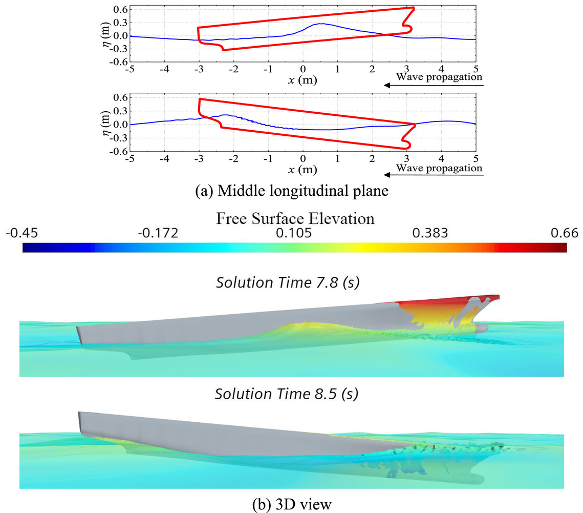 远洋航行船舶在其服役寿命期内可能会遇到罕见的畸形波浪,这在很大程度上影响了船舶的安全性。本文采用双向CFD-FEM流固耦合方法模拟船舶在三维畸形波浪中的运动和波浪载荷响应。首先,开发了使用MATLAB的内部代码来生成波浪参数,这些波浪参数用于在CFD求解器中生成短峰波浪和三维畸形波。对模拟的畸形波进行了检验,并分析了畸形波在传播过程中的演变过程。然后,分析了三维短峰波和三维畸形波中考虑水弹性响应的船舶运动和波浪载荷。定量研究了船舶遇到畸形波时运动和载荷响应的增加量。本研究为船舶在真实海域和极端畸形波中的极端动态响应提供了一些新见解。