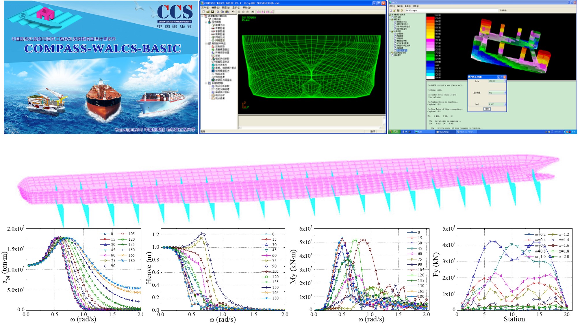 掌握COMPASS-WALCS-BASIC的计算原理并拥有软件版权,该程序适用于三维无航速浮体及常规航速船舶的运动响应及波浪载荷计算,包括单体船和多体船。功能主要包括:外壳网格自动划分、浮态自动计算及湿表面网格自动划分、一阶速度势的求解、水动力系数计算(包括附加质量和波浪辐射阻尼系数)、波浪绕射力和傅汝德-克雷洛夫力计算、运动响应计算、湿表面水动压力计算、剖面载荷计算(包括三个方向的轴向力和三个方向的弯矩)、运动及载荷的谱分析和长短期预报等。