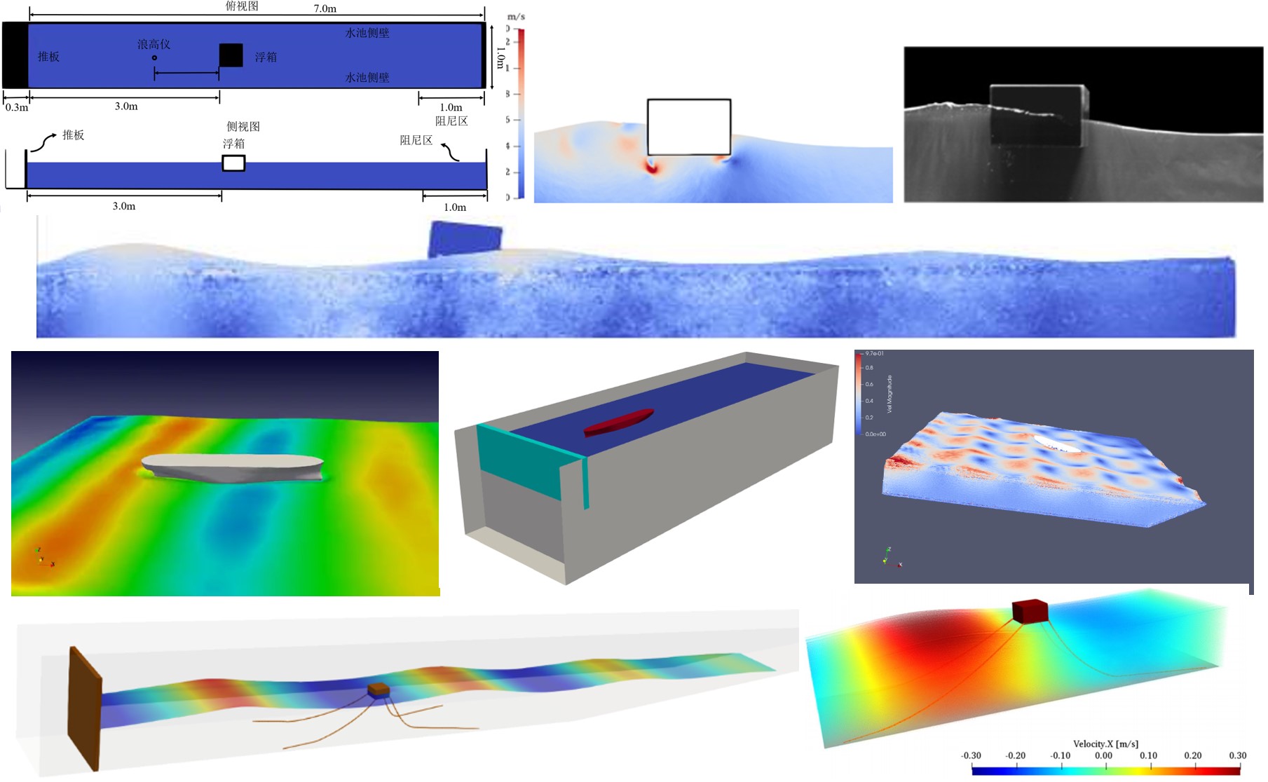 此外,模拟船舶、漂浮式或固定式海洋结构物在波浪中的水动力性能,对波面高程、船舶与结构物的运动、受力、砰击压力、流场速度与压力分布等数据进行监测,并能够采用MoorDyn模块实现系泊系统的功能。