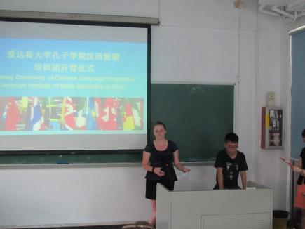 莫斯科高中教师代表 Lee Ann Eareckson和爱达荷孔子学院学生代表 Anna Daley Laursen在开营仪式上分别发言,感谢华工老师们和志愿者们的热情接待,希望通过此次培训能了解到更多中国历史和文化,为未来的职业发展提供另一个更好的选择。