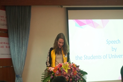 加拿大领队Robyn老师和两位学生代表随后发言。他们对华南理工大学和暨南大学工作人员为本次交流活动作出的巨大努力与精心准备表示了衷心的感谢。由于团队大部分成员都是第一次来中国,大家都希望通过本次交流好好地了解和感受中国的语言及文化,均表示对未来几天的课程和活动充满期待。