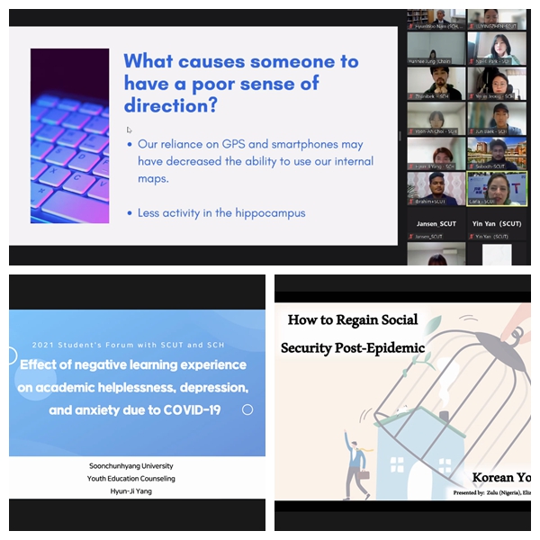 12月10日下午,由华南理工大学国际教育学院与韩国顺天乡大学联合举办的2021年度青年交流网络论坛圆满结束。国际教育学院胡贵平副院长、招生办公室吕剑虹老师、韩国顺天乡大学Nam HyunWOO教授以及来自两个大学的18名学生出席了本次“云论坛”。