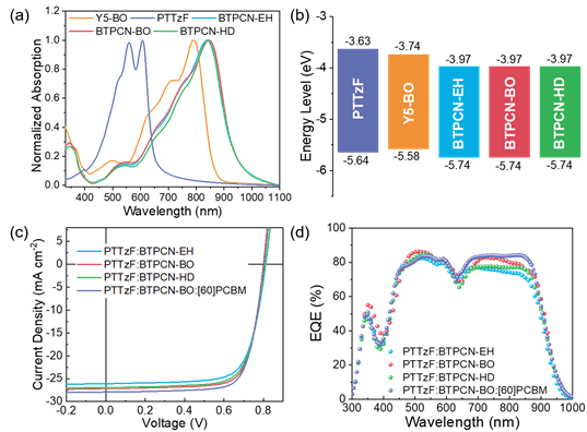 图3. PTTzF、Y5-BO、BTPCN-EH、BTPCN-BO和BTPCN-HD的(a)薄膜吸收光谱和(b)能级图;基于BTPCNs的OSCs的(c)J–V曲线和(d)EQE光谱