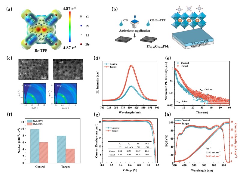 图 1. Br-TPP的静电势分析,机理分析,薄膜性能和钙钛矿太阳电池性能分析