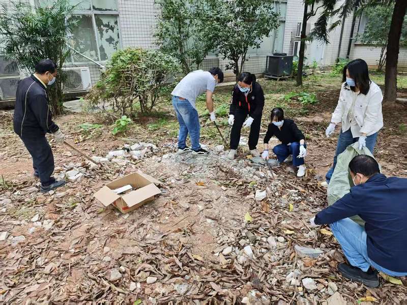 活动中,老师们手持清洁工具,迅速投入到卫生清扫工作中。大家分工协作、干劲十足,对实验室后方道路、空地进行“地毯式”清理。特别是楼后空地上陈年积累的建筑垃圾残余混杂在泥土和落叶枯枝中,清理难度很大,老师们不怕脏不怕累,清理出大量碎玻璃、瓷砖、钢筋水泥等废弃物,不留任何卫生死角,经过两个小时的努力共清理出各类垃圾三余车,用实际行动践行爱国卫生理念。