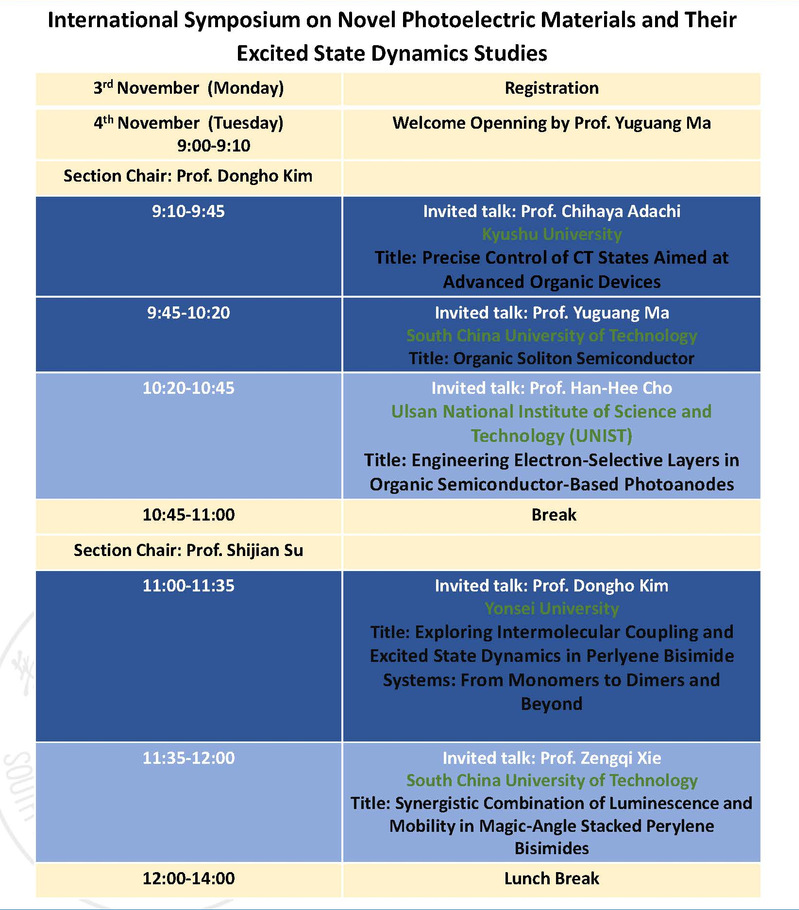 会议将邀请来自中国、日本、韩国等国家在光电材料与激发态动力学研究方面具有重要影响力的专家学者参会并进行学术报告,主要包括:日本九州大学 Chihaya Adachi教授,韩国延世大学Dongho Kim教授等。