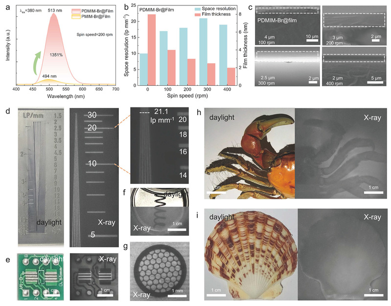 此外,通过原位溶液旋涂技术,成功制备出高均匀性、高透明度的PDMIM-Br@Film,其在X射线成像中展现出优异的空间分辨率和细节识别能力。