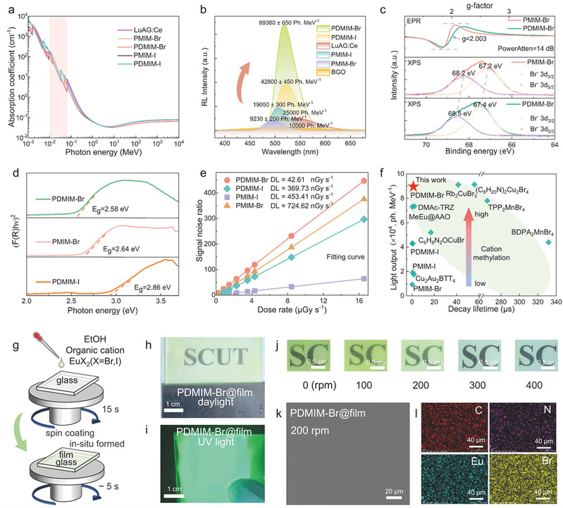 近日,华南理工大学发光材料与器件全国重点实验室夏志国教授课题组提出了一种有机阳离子甲基化修饰策略,在PMIMEuX3 (PMIM-X, PMIM = 1-丙基-3-甲基咪唑,X = Br, I)的基础上制备了PDMIMEuX3(PDMIM-X,PDMIM = 1-丙基-2,3-二甲基咪唑)。该策略通过引入甲基增强位阻效应,增大了Eu-Eu链间距,提升了结构刚性,从而抑制了非辐射复合和卤素空位缺陷。其中,PDMIM-Br的光输出达到商用LuAG:Ce晶体的3.57倍,检测限低至42.61 nGy s-1,并利用可原位溶液加工的特性成功制备出高透明度、大面积的均匀闪烁薄膜,X射线成像空间分辨率高达21.1 lp mm-1,表现出卓越的性能。