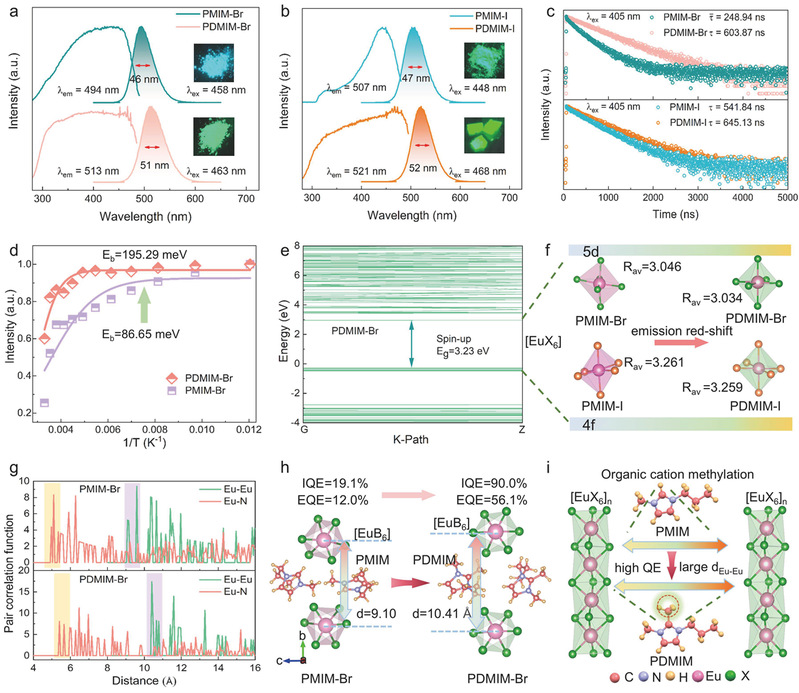 甲基化后卤化物闪烁体的熔点、激子结合能、热稳定性和发光效率均显著提升。理论计算进一步表明5d-4f跃迁是闪烁体的载流子来源。同时,揭示了发射红移的机制是由晶体场强度和Eu–X键长所引起的。更重要的是,有机阳离子甲基化策略通过位阻效应增加了Eu-Eu链间距,发光效率提升了数倍。