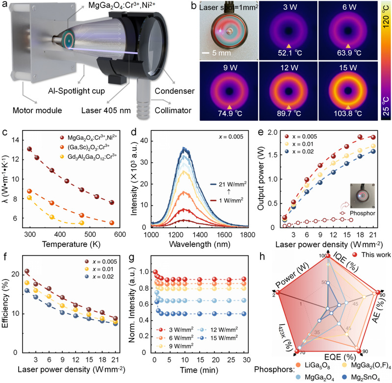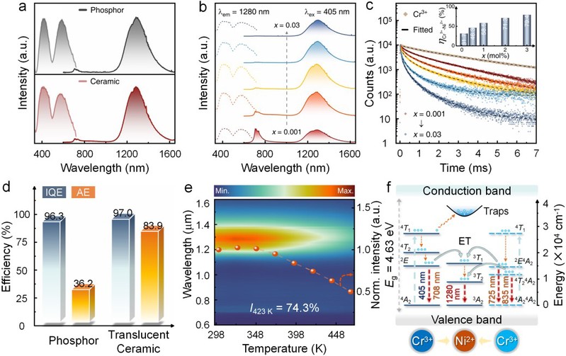 近日,华南理工大学发光材料与器件全国重点实验室夏志国教授团队成功研制了Cr3+-Ni2+共掺杂的MgGa2O4:xCr3+,yNi2+ (x = 0.03;y = 0.001-0.03)半透明陶瓷,通过构建高效的能量传递通道,获得了高达81.4%的光致发光外量子产率,并展现出优异的抗热猝灭性能(I423K = 74.3%)。所构建的动态激光驱动NIR-II光源在18 W/mm2的405 nm近紫外激光激发下,获得了超过1.86 W的瓦级光输出。本研究还将该主动光源-探测成像系统与图像处理算法集成,将其应用于雾霾环境中的穿透光学成像,有望推动新一代智能光谱成像技术的发展。