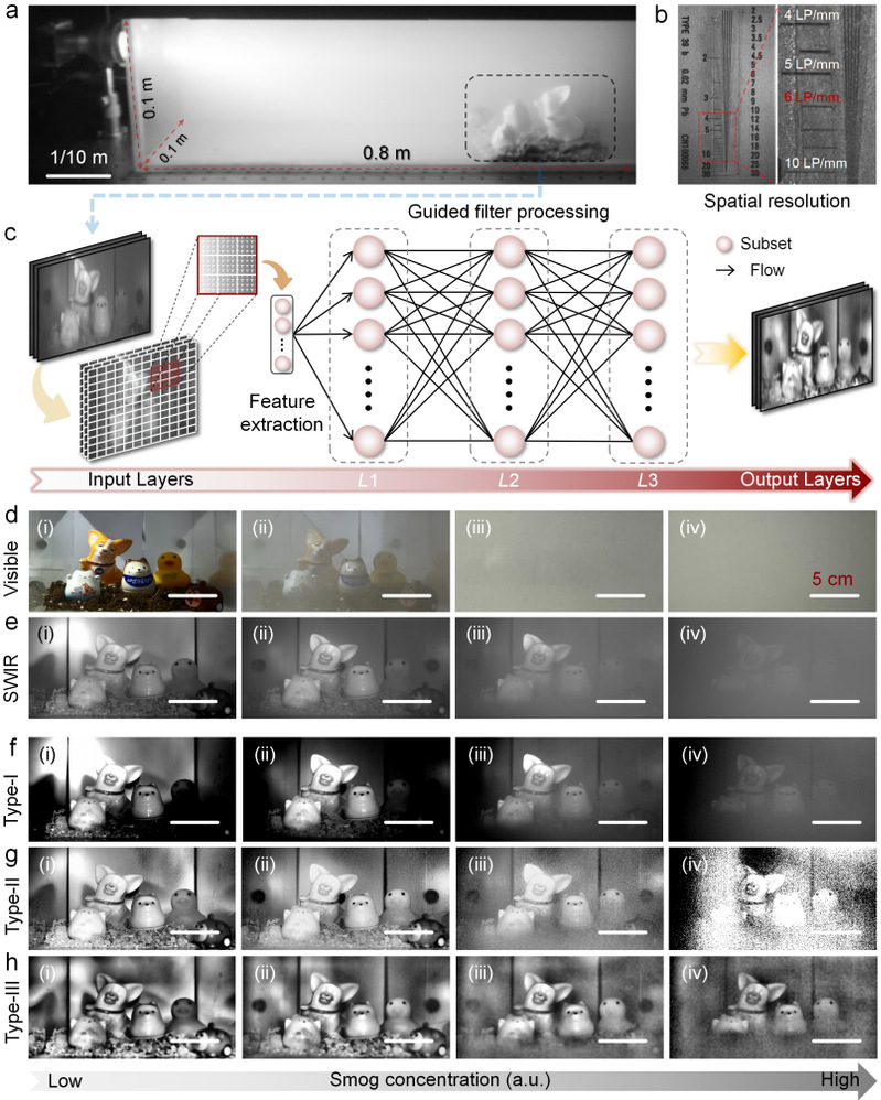 本研究通过放电等离子体烧结技术,成功制备了Cr3+-Ni2+共掺杂尖晶石型半透明陶瓷。该陶瓷相对密度达99.2%,在405nm近紫外光激发下呈现发射峰值1280 nm的宽带NIR-II发光,外量子效率(EQE)达到了81.4%。基于该陶瓷构建的动态NIR-II光源,通过高速旋转增强空气对流散热以提升陶瓷材料服役特性及器件稳定性,输出功率超1.86 W。借助导向滤波网络(GFN)图像算法的辅助,该装置可在高浓度雾霾环境中实现精准目标成像与识别。本研究不仅为Cr3+-Ni2+共掺杂半透明陶瓷的研制提供了备选方案,更促进了激光驱动NIR-II光源与图像处理算法在强散射介质成像检测中的应用,为环境监测、安全检测等应用领域提供关键技术支撑。