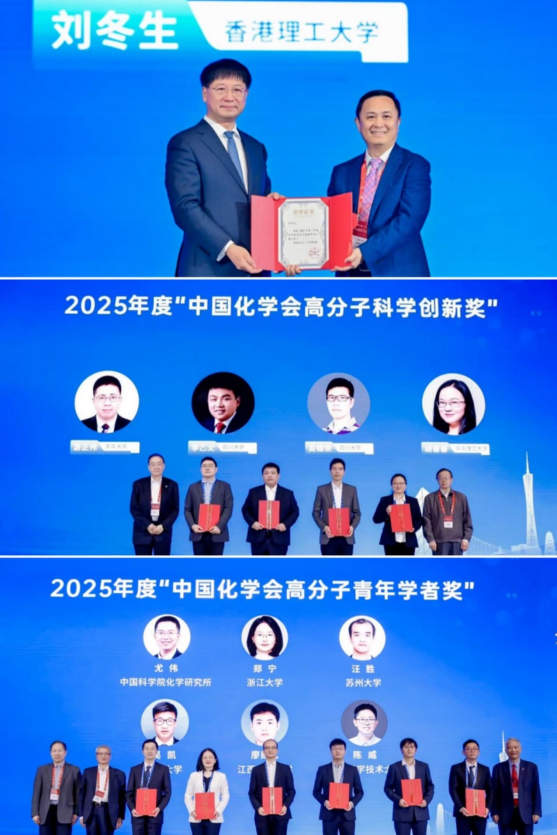 会上为刘冬生等11位优秀学者分别颁发“中国化学会高分子基础研究王葆仁奖”“中国化学会高分子科学创新奖”和“中国化学会高分子青年学者奖”三大奖项。