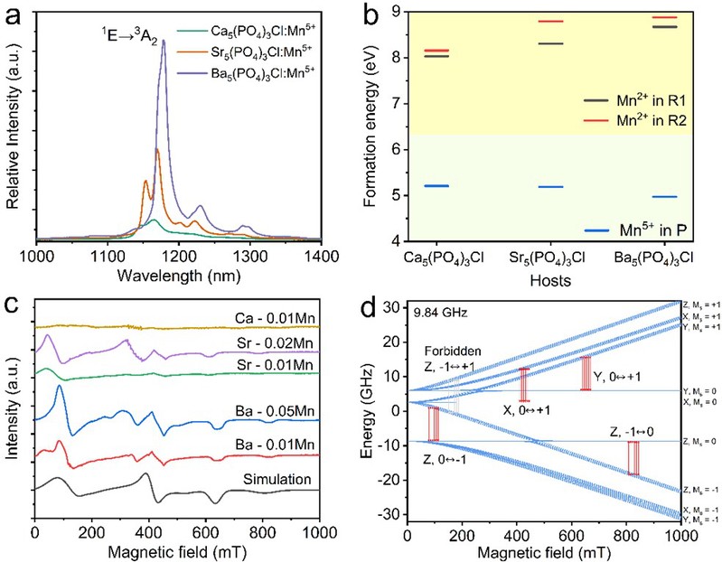 图1. R5(PO4)3Cl:Mn5+(R=Ca, Sr, Ba)的发光光谱、DFT计算及EPR图谱