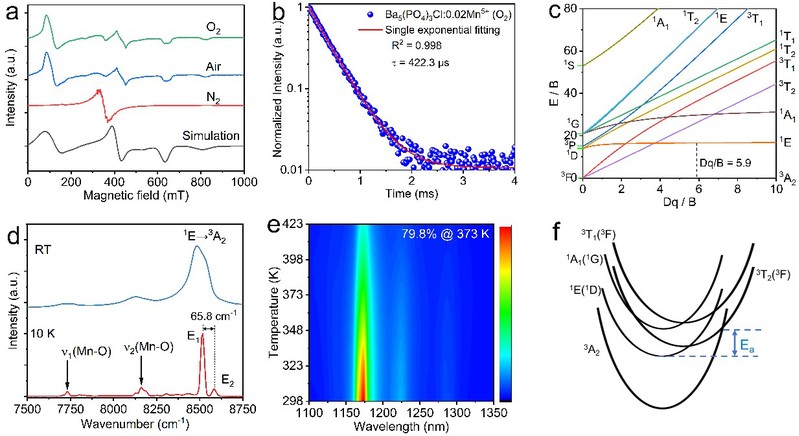 近红外(NIR)光学成像技术因其广泛地应用于生物医学成像、夜视和信息领域,受到了广泛的研究关注。与NIR-I(700-950 nm)光相比,NIR-II(1000-1700 nm)光具有生物组织自荧光减少、信噪比增加和更深组织穿透的优势,这对于提高图像的空间分辨率至关重要。然而,开发高效的NIR-II光源仍然是一个挑战。具有3d2电子构型的过渡金属离子Mn5+,通常在四面体晶场中于1100-1300 nm范围内表现出尖锐的NIR-II发光,已被用于近红外激光和发光测温。此外,Mn5+离子在可见光区域具有宽而强的吸收带,因此,其可被多种激发光源激发。然而,Mn5+的发射仅在少数基质材料中得到证实,因为很难稳定Mn为+5价态。